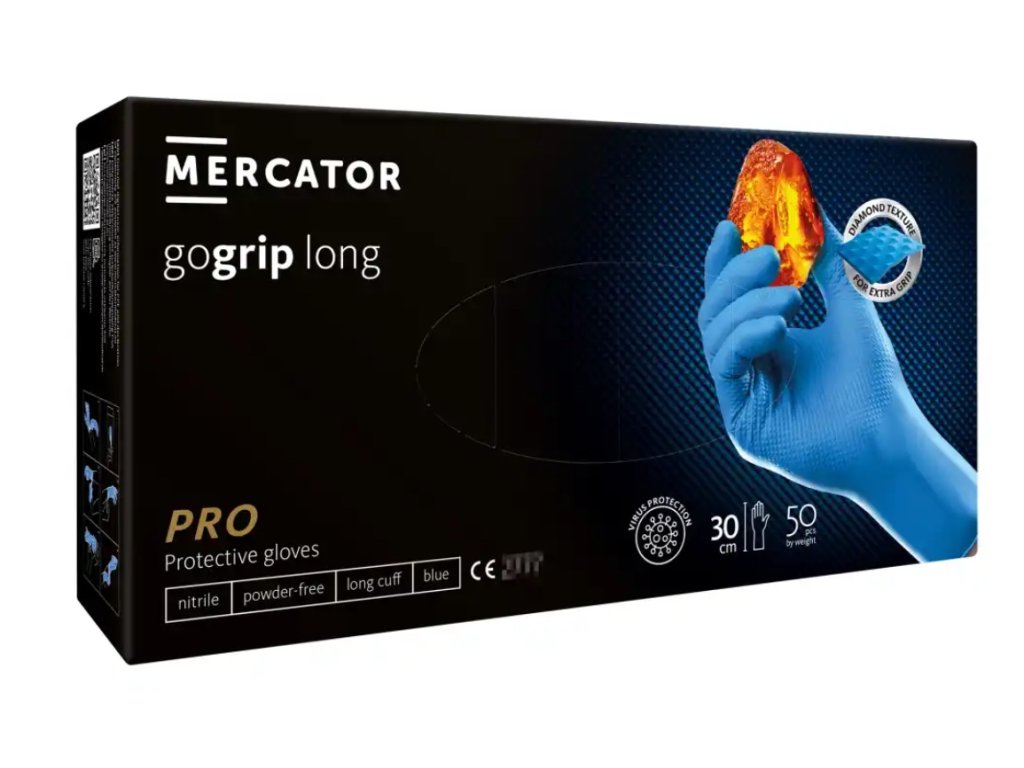 Mimořádně elastické MERCATOR gogrip long jsou třikrát silnější než standardní rukavice dostupné na trhu. Tyto rukavice vyrobené z pevného nitrilu se vyznačují revoluční diamantovou 3D texturou, díky níž je Váš úchop silný a stabilní, a současně nesnižuje Vaši přesnost. Originální struktura MERCATOR gogrip zajistí, že můžete ovládat mobilní zařízení bez sundávání rukavic – a tím pádem jsou Vaše ruce celou dobu chráněny před vnějšími faktory. Díky jedinečné konstrukci se Vaše ruce nepotí, a jste tak méně vystaveni výskytu podráždění kůže. Ideálně uzpůsobené manžety rukavic garantují komfort při práci, a dokonale viditelná, intenzivní zelená barva se vyjímá v jakémkoli prostředí.